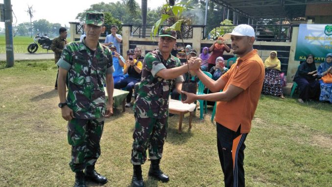 SERAH TERIMA : Komandan Koramil 10/Sukatani Mayor Arm Apriansyah saat menyerahkan pohon kepada perwakilan Kecamatan Sukakarya.