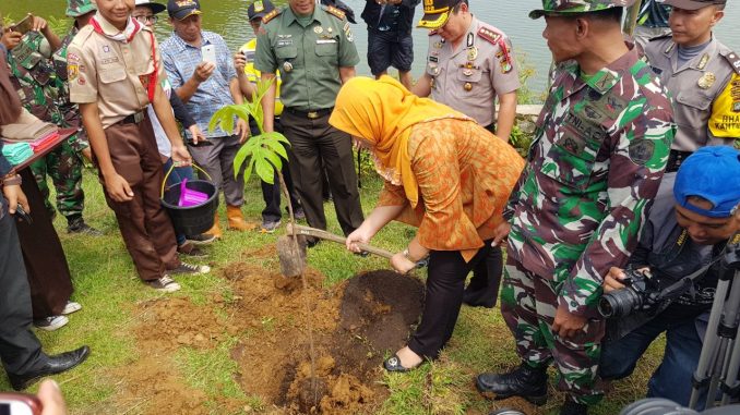 BOJONGMANGU – Bupati Bekasi, Neneng Yasin, menghadiri kegiatan penanaman sejuta pohon sukun di area Situ Abidin, Bojongmangu, Kabupaten Bekasi, Minggu (11/3). Selain Bupati, giat yang diprakarsai Kodim 0509/Bks itu juga dihadiri Polres Metro Kabupaten Bekasi, Kepala Dinas (Kadis) Lingkungan Hidup, Daryanto, Kadis Pariwisata, Sutiaresmulyawan, Camat Bojongmangu, Agung Suganda, pengelola kawasan industri, serta pecinta lingkungan.