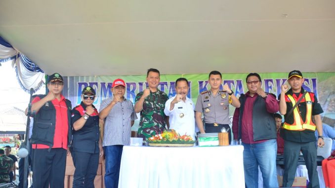 BEKASI SELATAN – Penjabat (Pj) Wali Kota Bekasi Ruddy Gandakusumah, Kapolres Metro Bekasi Kota Kombes Pol Indarto, dan Komadan Kodim 0507/Kota Bekasi Letkol Arm Abdi Wirawan hadiri panggung aspirasi buruh pada peringatan Hari Buruh Internasional di Alun-Alun Kota Bekasi, Selasa, (1/5/2018).