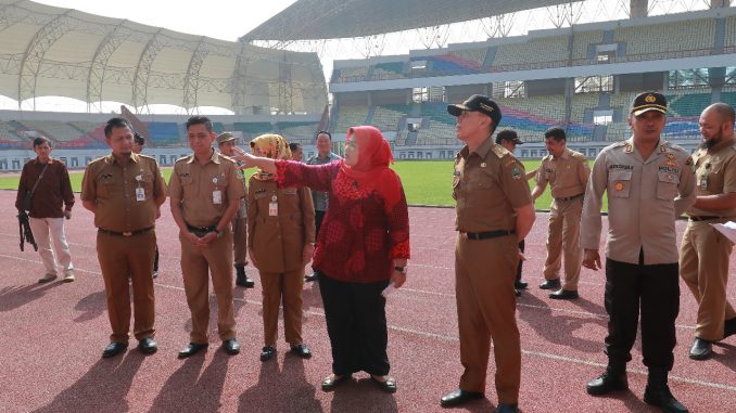 SAMBANGI STADION: Bupati Neneng Hasanah Yasin saat periksa kondisi dan fasilitas Stadion Wibawa Mukti yang akan digunakan sebagai venue sepak bola Asian Games.