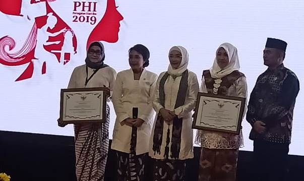 SEMARANG – Menteri Pemberdayaan Perempuan dan Perlindungan Anak (PPPA), Bintang Puspayoga memberikan penghargaan kepada Kepala Desa (Kades) Lambangsari, Tambun Selatan Kabupaten Bekasi, Pipit Haryanti pada Peringatan Hari Ibu 2019 di Kota Semarang, Jawa Tengah, Minggu (21/12/2019).