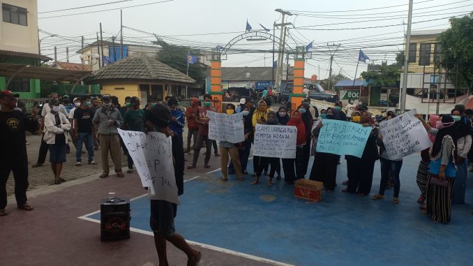BABELAN – Puluhan warga RW 01 Kelurahan Kebalen, Kecamatan Babelan berunjuk rasa di kantor kelurahan setempat pada Selasa (10/11/2020).