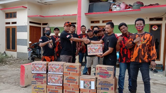 Ketua PAC PP Babelan, Irwansyah bersama pengurus dan anggota saat menyalurkan bantuan paket mie instan kepada Ketua RT20/01, Dusun 1, Desa Babelan Kota, Latip, pada Jumat (12/02/2021).