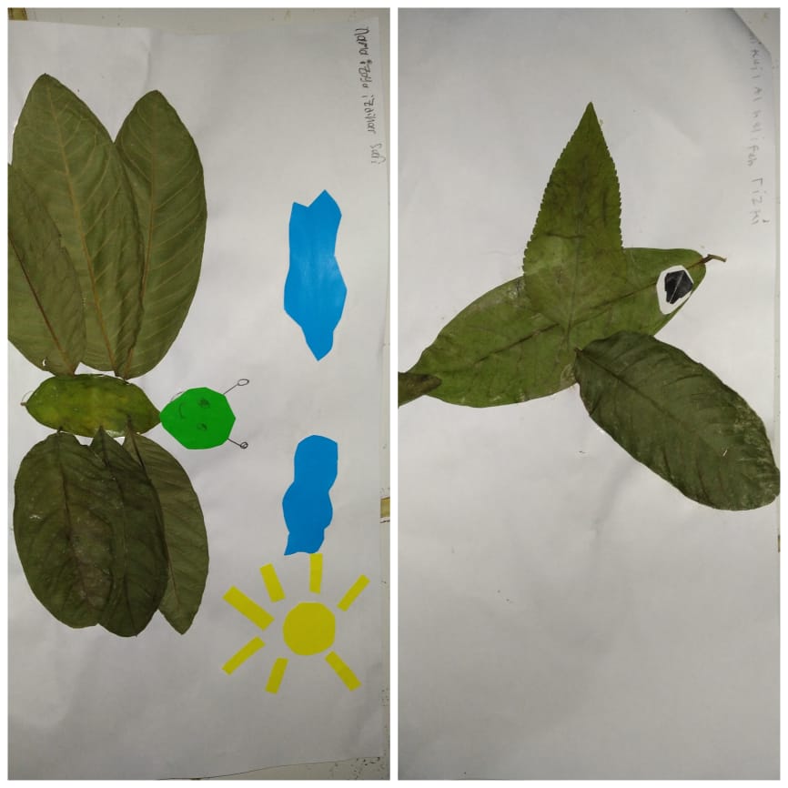 Dalam kegiatan pelatihan membuat kolase ini, saya menggunakan bahan bekas, dan juga daun-daunan untuk membuat kolase.