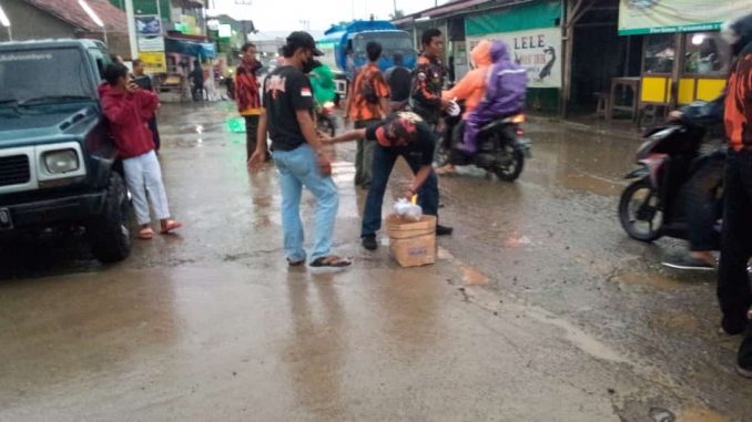 BABELAN – Pengurus dan anggota Pemuda Pancasila (PP) Ranting Desa Kedung Pengawas, Kecamatan Babelan, tidak patah semangat untuk membagikan ratusan takjil kepada pengguna jalan yang melintas di depan Gerbang Perumahan AFI 2, meski diguyur hujan pada Jumat (22/04/2022).