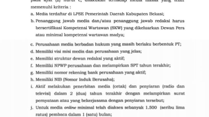 Sesuai ketentuan yang ada dalam Peraturan Bupati (Perbup) Bekasi Nomor 209 Tahun 2022 tentang Penyebarluasan Informasi Penyelenggara Pemerintahan, papar Bob, sangat jelas dan tegas bahwa kriteria pihak ketiga atau perusahaan media yang bisa dan dapat dijadikan mitra harus dan wajib memenuhi 11 (sebelas) kriteria.