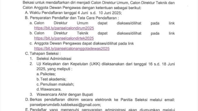 CIKARANG PUSAT – Pemerintah Kabupaten Bekasi melalui Sekretariat Daerah selaku Panitia Seleksi (Pansel) telah menerbitkan surat pengumuman dengan Nomor: 500/008/Pansel-Perumda TB/ 2025 Tentang Pelaksanaan Seleksi Calon Direksi dan Dewan Pengawas Independen Perumda Tirta Bhagasasi Tahun 2025.